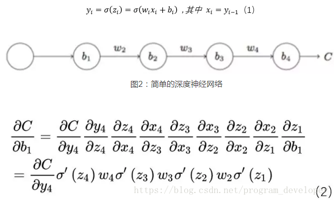 我们以下图的反向传播为例,假设每一层只有一个神经元且对于每一层都可以用公式1表示,其中σ为sigmoid函数,C表示的是代价函数,前一层的输出和后一层的输入关系如公式1所示。我们可以推导出公式2。