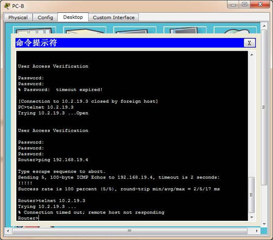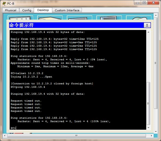 在PC-B命令提示符中telnet路由R2的s0/0/1接口:地址时10.2.19.2.退出telnet阶段: