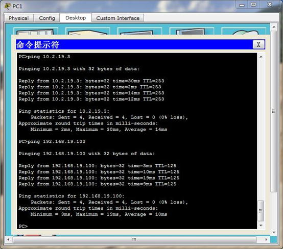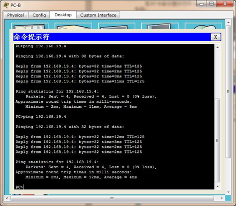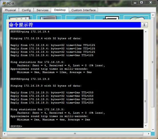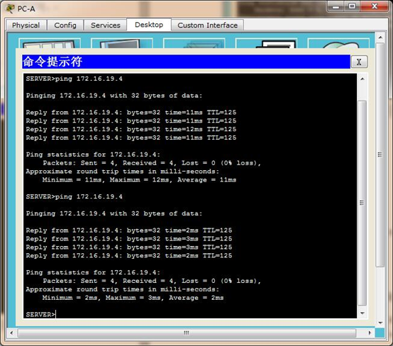 验证:在PC-B的命令提示符中ping PC-A服务器