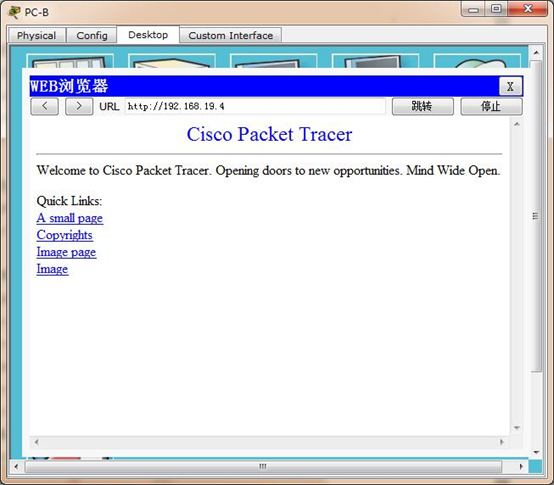 在PC-B开一个网页浏览器登入PC-A来展示网页。关掉PC-B的浏览器。