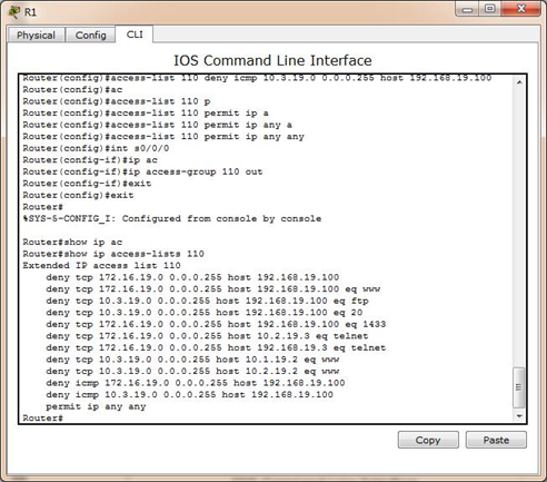 R1(config)#access-list 110 deny icmp 10.3.19.0 0.0.0.255 host 192.168.19.100