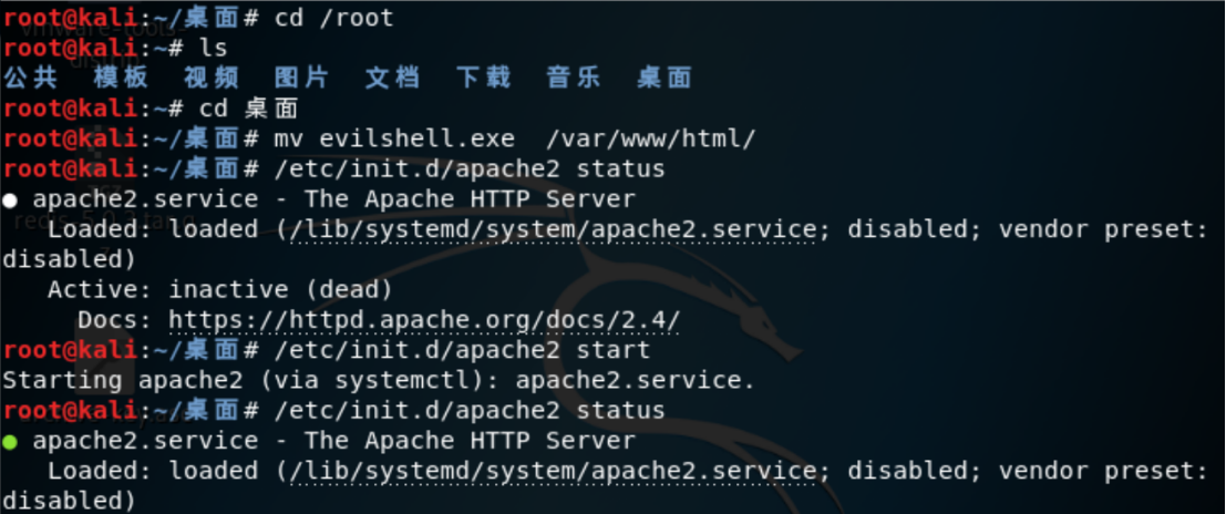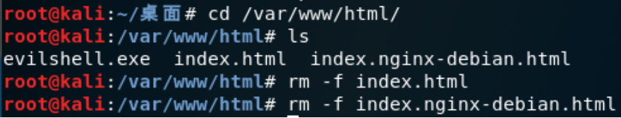 3.将木马文件evilshell.exe拷贝到/var/www/html,把html目录下的其余文件删除,并开启apache服务(这一部是为了提供一个可以把木马文件下载的平台)