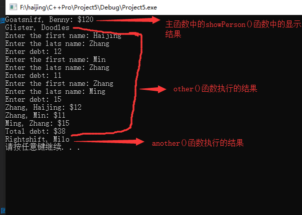 27 using namespace debts; //使用using编译指令,使名称空间debts中的名称在other()函数中都可用