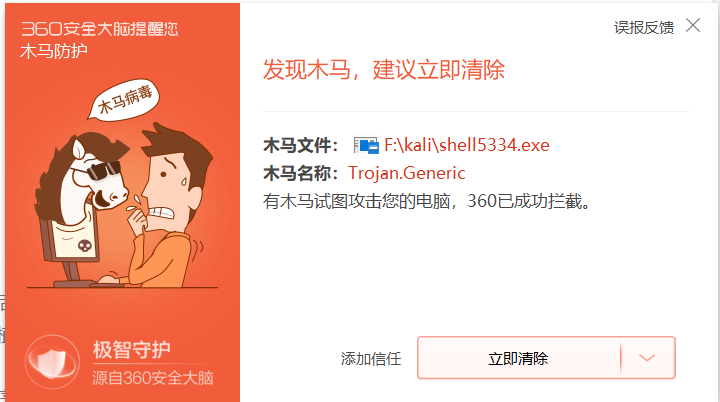 任务三:用另一电脑实测,在杀软开启的情况下,可运行并回连成功,注明电脑的杀软名称与版本
