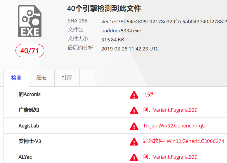 以上尝试可以看出没有处理的后门程序基本上都可以检测出来。