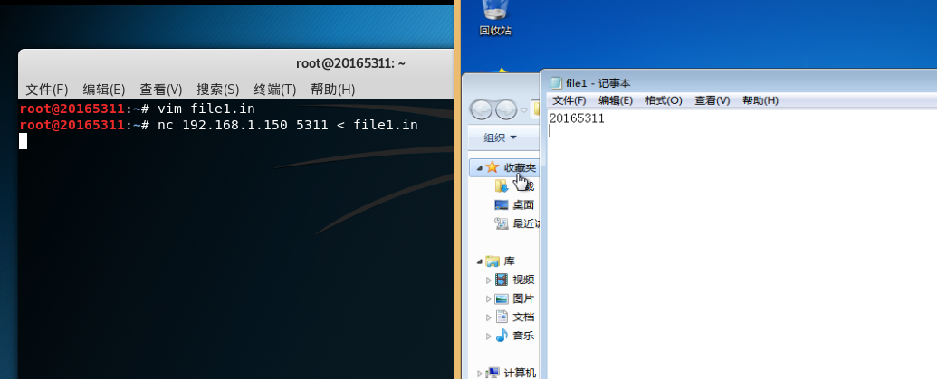 在Linux中执行nc 192.168.1.150 < 20165311_backdoor.exe,这里的IP为被控主机IP