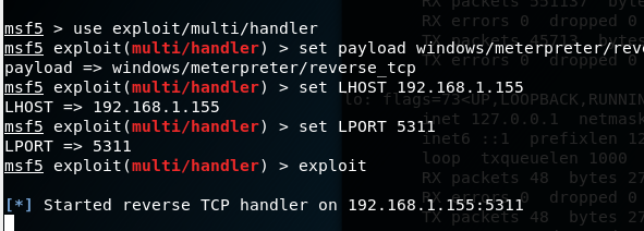 set LHOST 192.168.1.155 ,这里用的是LinuxIP,和生成后门程序时指定的IP相同