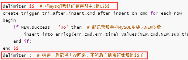if NEW.success = 'no' then # 新记录都会被MySQL封装成NEW对象