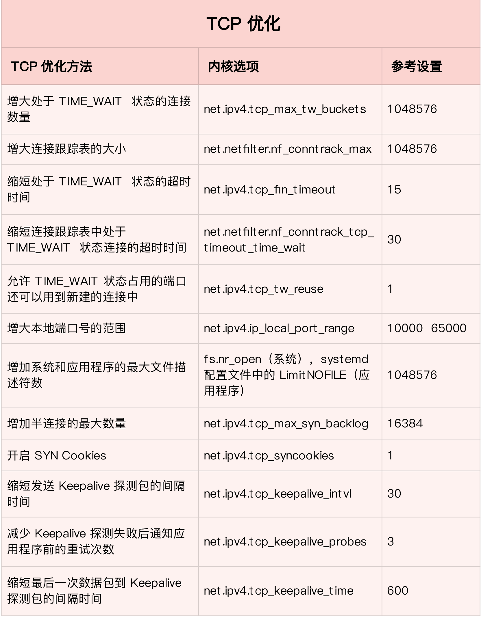 讲了这么多 TCP 优化方法,我也把它们整理成了一个表格,方便你在需要时参考(数值仅供参考,具体配置还要结合你的实际场景来调整):