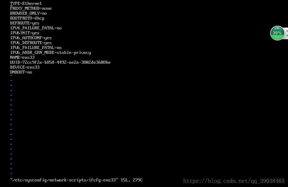 然后,输入vi /etc/sysconfig/network-scripts/ifcfg-ens33命令(注意vi与/etc之间有空格),输入这个命令后,会打开ifcfg-ens33这个文件,如图: