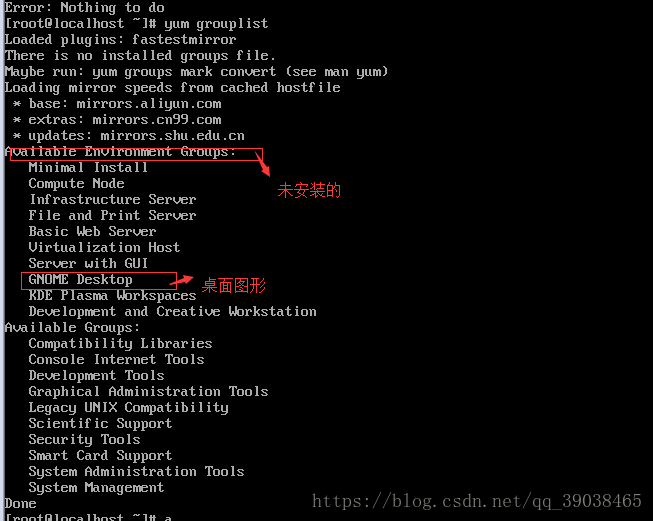 我们上面进行安装的时候选择的是“最小安装",所以进入的是linux的命令行界面,如果我们想要拥有windows的图形化界面,就需要自己安装。演示如下:
