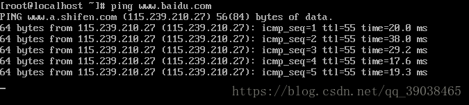 修改完成后按“Esc”退出编辑,按“:wq”保存编辑。然后执行service network restart命令,等待重启network。开机后输密码进入操作系统,接着再次换root账户进入终端。 输入“ping www.baidu.com”出现如下图所示,即连上了网络,按ctrl +c 结束指令。