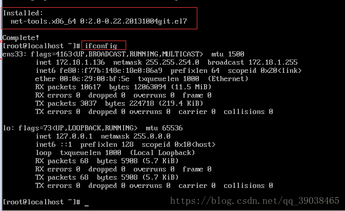 执行上述指令后进行安装,安装完成后会出现Complete!,执行“ifconfig”演示如下: