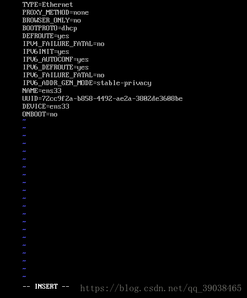 先使用方向键将光标移动到ONBOOT=no那一行,然后按下字母 “i”,此时屏幕下方会出现“INSERT”字样,就可以进行修改操作,如下图所示: