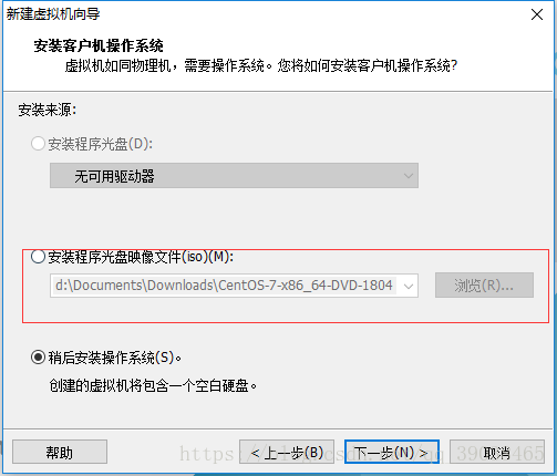 这里注意将你下载的Centos文件导入,然后选择“稍后安装操作系统”,接着选择点击下一步