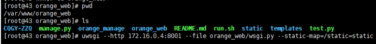 uwsgi --http 172.16.0.4:8001/ --file orange_web/wsgi.py --static-map=/static=static //使用uwsgi启动Django项目