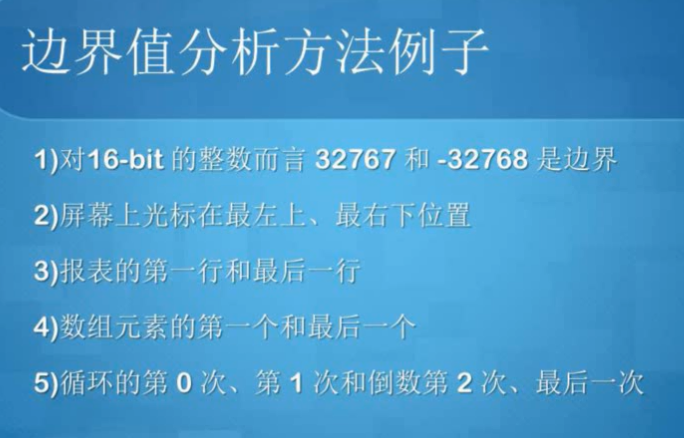 1)若输入条件规定了取值范围,则选择恰好落在边界上和处在边界内、边界外的测试值