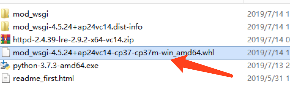 找到mod_wsgi--->server--->mod_wsgi.cp37-win_amd64.pyd 拷贝这个文件到apache安装目录下的modules,并且改名字为mod_wsgi.pyd