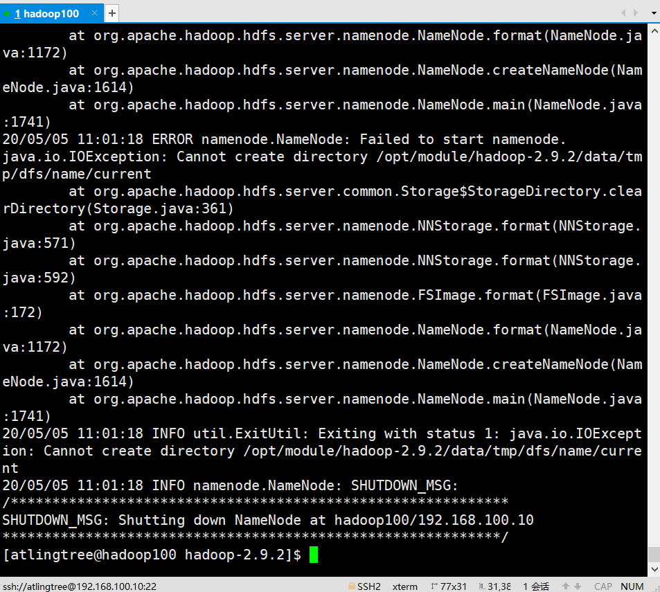 starting namenode, logging to /opt/modules/hadoop-2.9.2/logs/hadoop-atlingtree-namenode-hadoop100.out