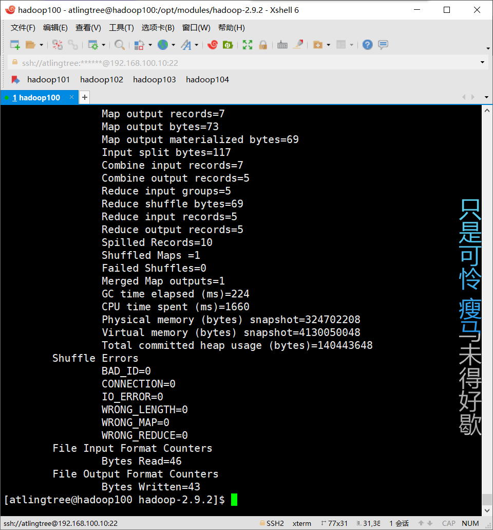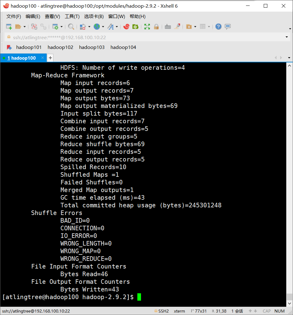 [atlingtree@hadoop100 hadoop-2.9.2]$ bin/hadoop jar share/hadoop/mapreduce/hadoop-mapreduce-examples-2.9.2.jar wordcount /user/atlingtree/input /user/atlingtree/output