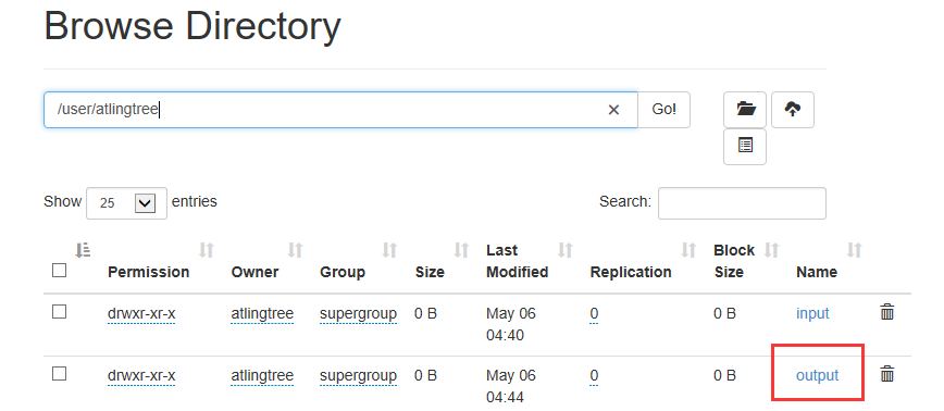 我们运行集群上 /user/atlingtree/input 的文件,同时将运行结果放在/user/atingtree/output