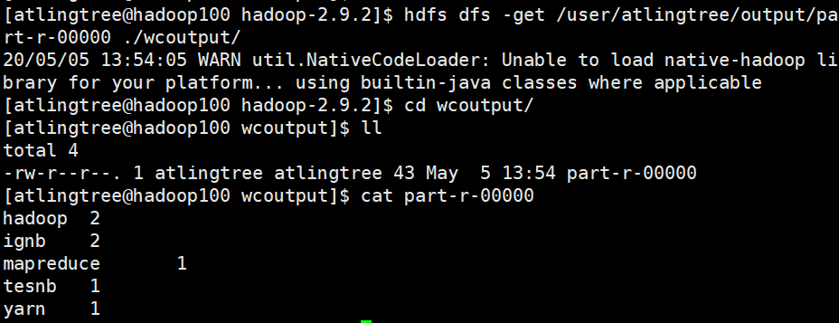 [atlingtree@hadoop100 hadoop-2.9.2]$ hdfs dfs -get /user/atlingtree/output/part-r-00000 ./wcoutput/
