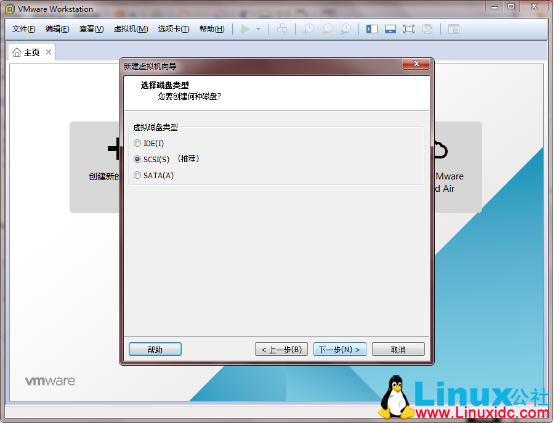 11.“虚拟磁盘类型”选择推荐的“SCSI”,然后“下一步”