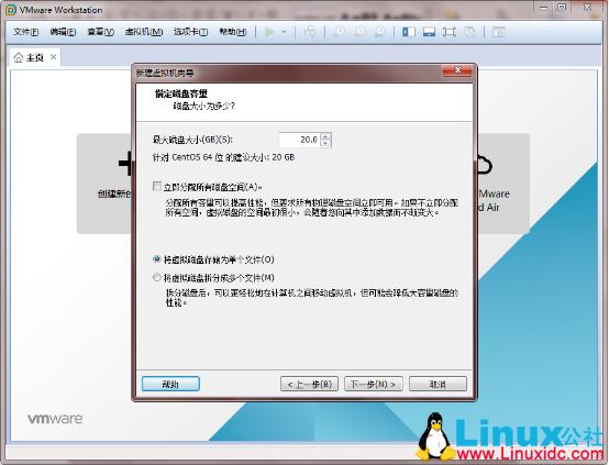 13.“指定磁盘容量”选择建议的大小,自己可以设置大点。然后选择“将虚拟磁盘存储为单个文件”