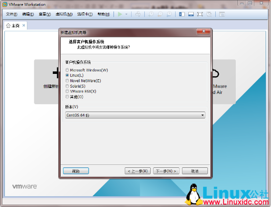 5.“客户机操作系统” 选择 “Linux” 、“版本”选择“CentOS 64位” ――》下一步: