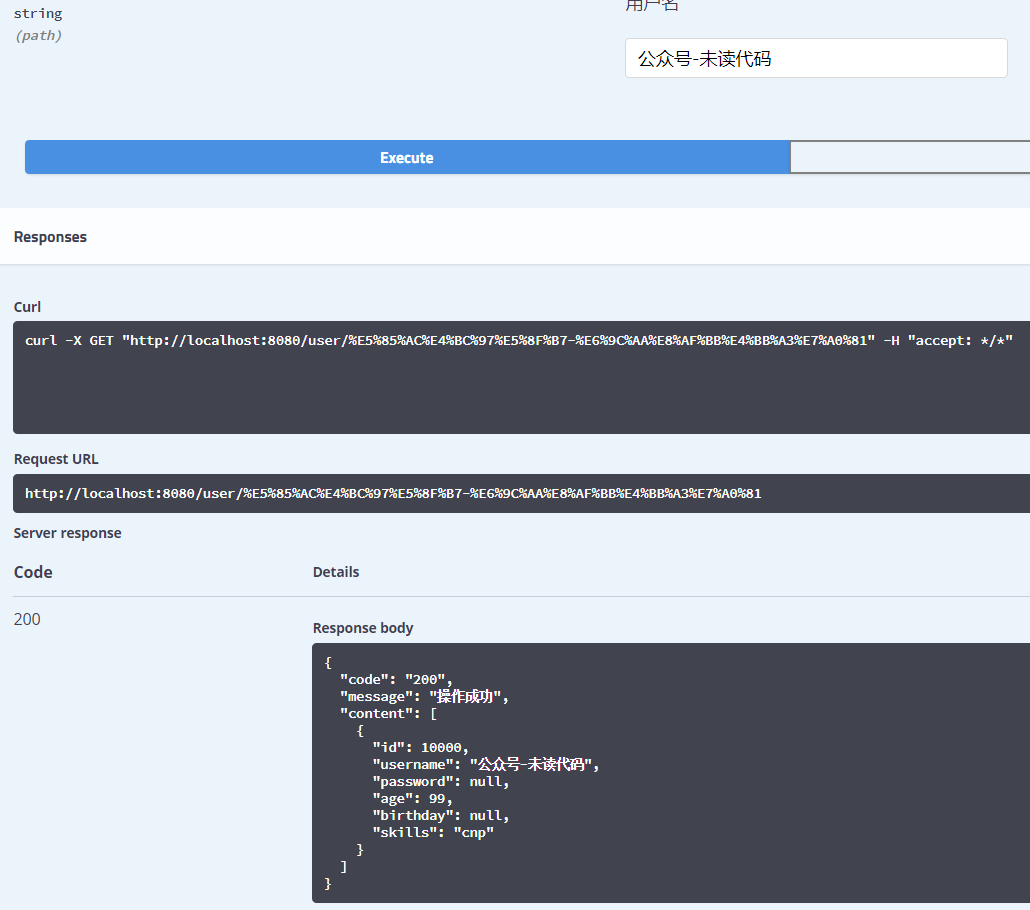 - 点击接口 [/user/{username}] 获取单个用户信息。
