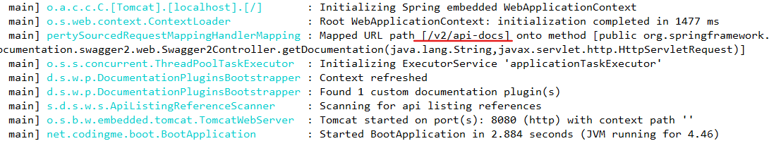直接启动 Springboog 项目,可以看到控制台输出扫描到的各个接口的访问路径,其中就有 /2/api-docs。