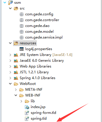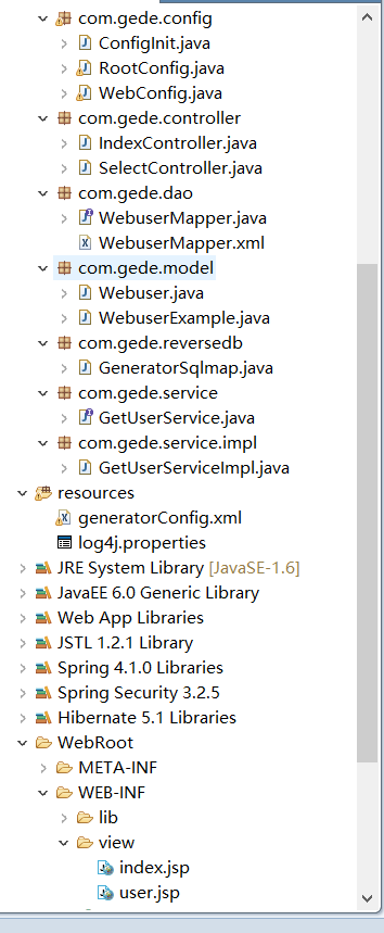 以前用着SSH都是老师给配好的,自己直接改就可以。但是公司主流还是SSM,就自己研究了一下Java版本的配置。网上大多是基于xnl的配置,但是越往后越新的项目都开始基于JavaConfig配置了,这也是写此文章的原因。不论是eclipse还是myeclipse 都没有集成mybatis的相关组件,Spring也没有对其进行兼容,所以说我们会用到一些mybatis提供的核心jar包。下面先看一下我们的项目结构,我先自建了一个集成spring4.1的 ssm web项目(红色箭头指向注意删除web.xml配置,因为后期会和我们的java配置冲突而导致项目失败),结构如下图: