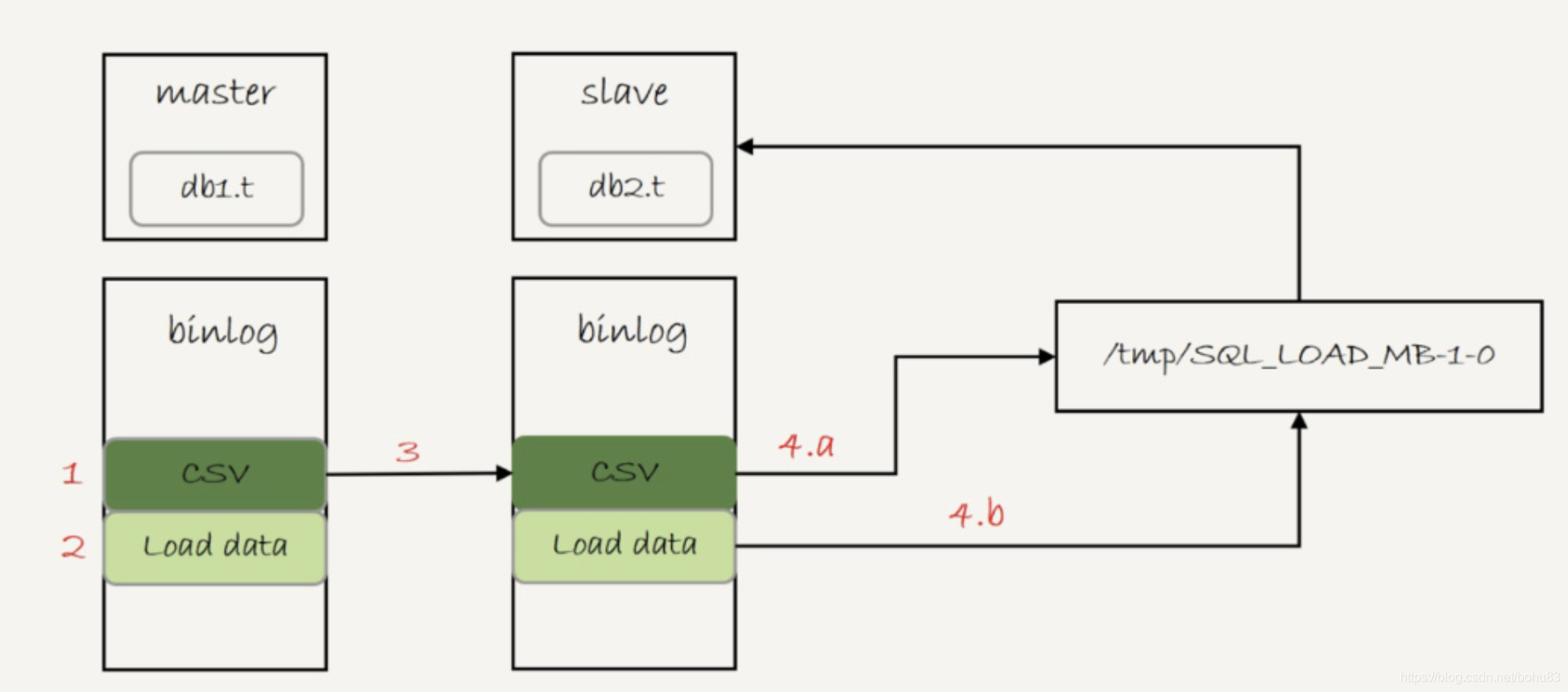 a. 先将binlog中t.csv文件的内容读出来,写入到本地临时目录/tmp/SQL_LOAD_MB-1-0 中;