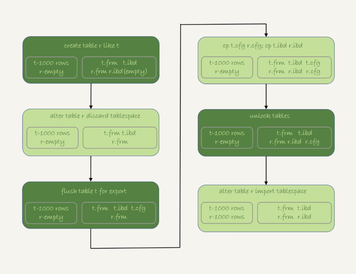 - 执行alter table r import tablespace,将这个r.ibd文件作为表r的新的表空间,由于这个文件的数据内容和t.ibd是相同的,所以表r中就有了和表t相同的数据。