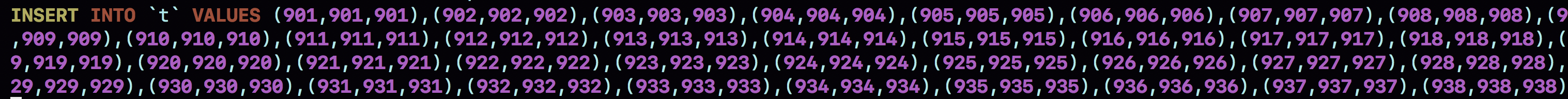 可以看到,一条INSERT语句里面会包含多个value对,这是为了后续用这个文件来写入数据的时候,执行速度可以更快。