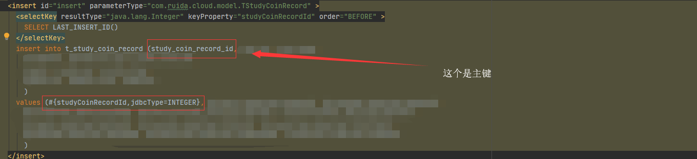 这个是主键,在自动生成的sql中有添加,但是已经设置自增,虽然业务层并没有给主键数据初始化,但是在解决问题的时候还是考虑到会有冲突,如有遇到这种可以试试将主键的添加操作删掉,同时考虑被删的还有上面selectKey里的