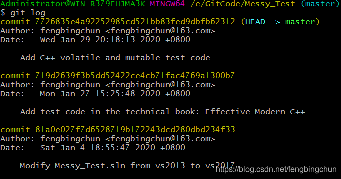 1. 对Messy_Test项目执行git log,查看历史提交记录,结果如下图所示,最近的一次提交commit id为:7726835e4a92252985cd521bb83fed9dbfb62312,分支名为master