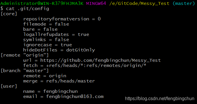 2. 在Messy_Test项目中.git/config内容如下:注意此时[remote “origin”]的内容: