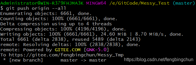 5. 执行push,结果如下图所示:执行完后已将Messy_Test的code提交到Gitee的Messy_Tmp项目上并保留历史提交记录。