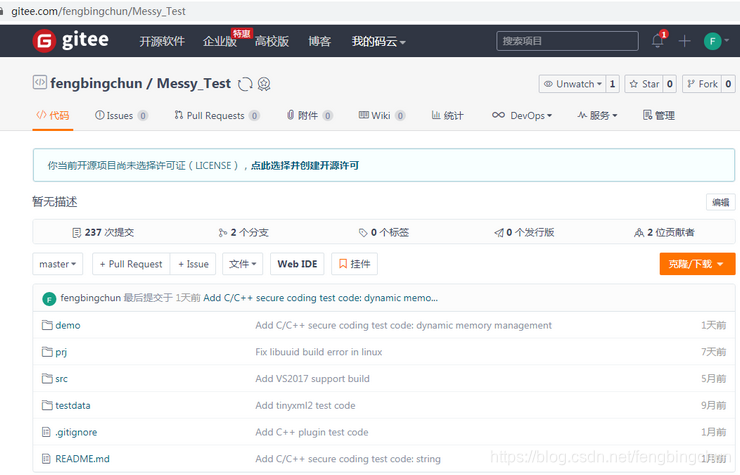6. 打开Gitee的Messy_Tmp项目,结果如下图所示:保留了原有项目Messy_Test的历史提交记录,此时只有Messy_Test项目的master分支的内容,没有其它分支。