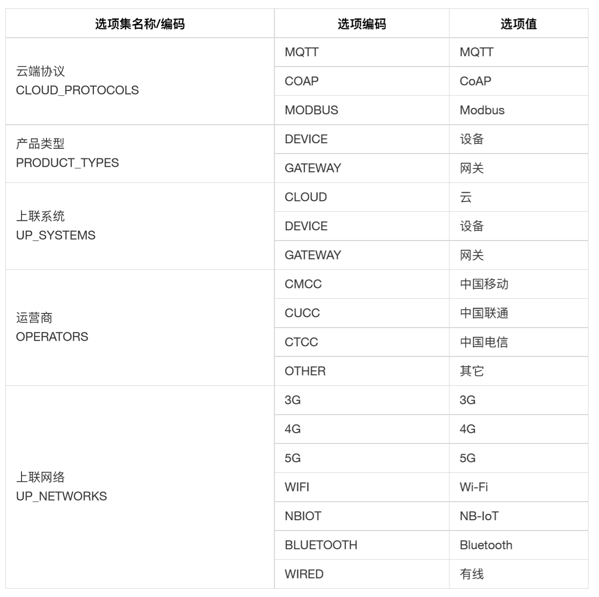 重复以上1~3的步骤创建 云端协议、产品类型、上联系统、运营商和上联网络 选项集: