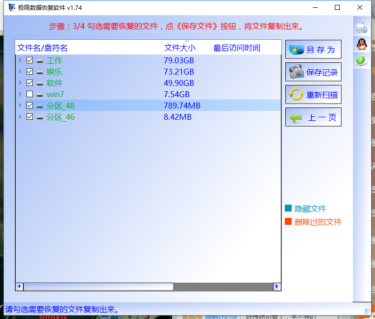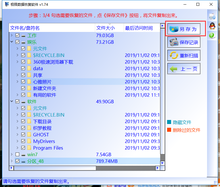步骤4:勾选所有需要恢复的资料,然后点右上角的保存,《另存为》按钮,将勾选的文件COPY出来。