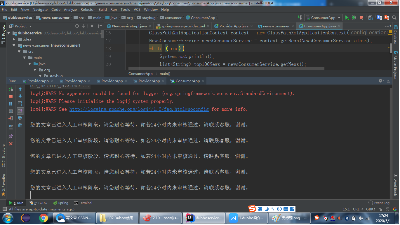 1.创建一个普通Maven工程dubboservice,有3个子模块,服务接口模块news-ervice,定义了服务的规范;服务提供者模块news-provider,依赖服务接口模块,实现其规范,提供服务;服务消费者模块news-consumer,依赖服务接口模块,通过服务接口从注册中心拿到对应的服务。