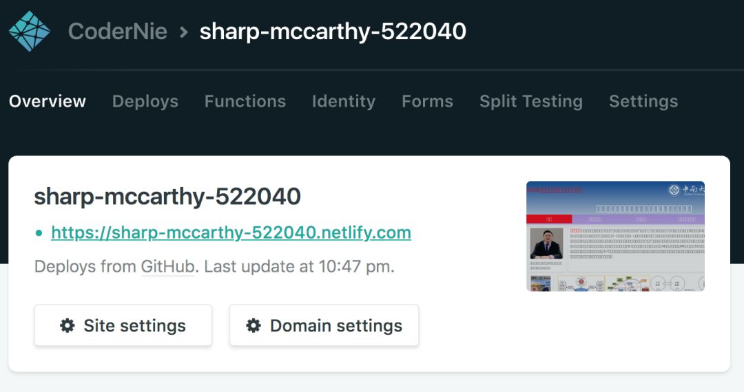 可以看到netlify为我们随机生成了一个netlify下的域名,这里我们可以更改其前缀,并绑定到我们自己的域名下: